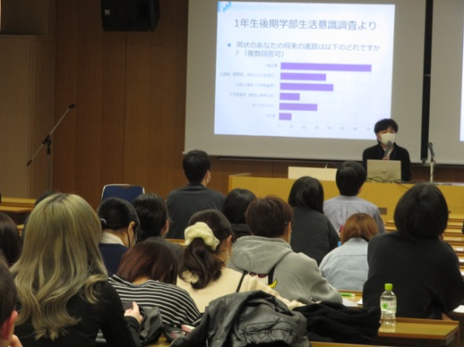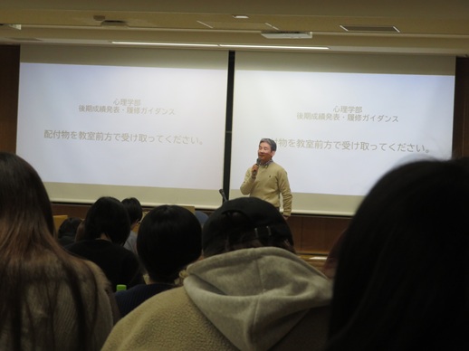 ガイダンスでは、学年ごとに科目の履修や心理学検定の対応、キャリア支援などに関する説明を受け、新年度を迎えるにあたり、気を引き締める様子がうかがえました。