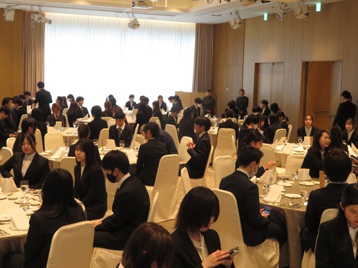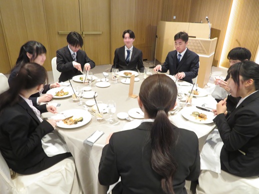 新入生のみなさんは(そして教員も?)、緊張した様子で席に着きましたが、ナビゲーター役の方の流れるような進行のおかげもあり、非常に和やかな雰囲気の中で美味しい料理を味わうことができ、お腹だけではなく、心もすっかり満たされたようです。