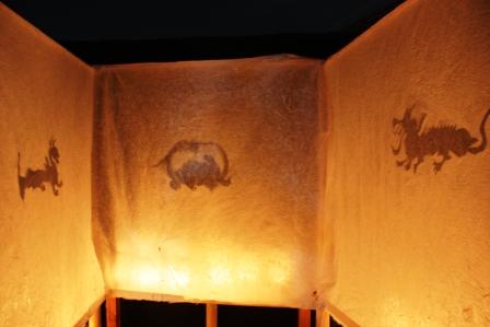 墳内部の石室を紙で作り、四神を影絵で四方に配置しました。会場を訪れた人たちは、四神や1300年の文字が浮かび上がるカップキャンドルで石室に導かれ、天井から飛鳥の夜空を眺めていました。