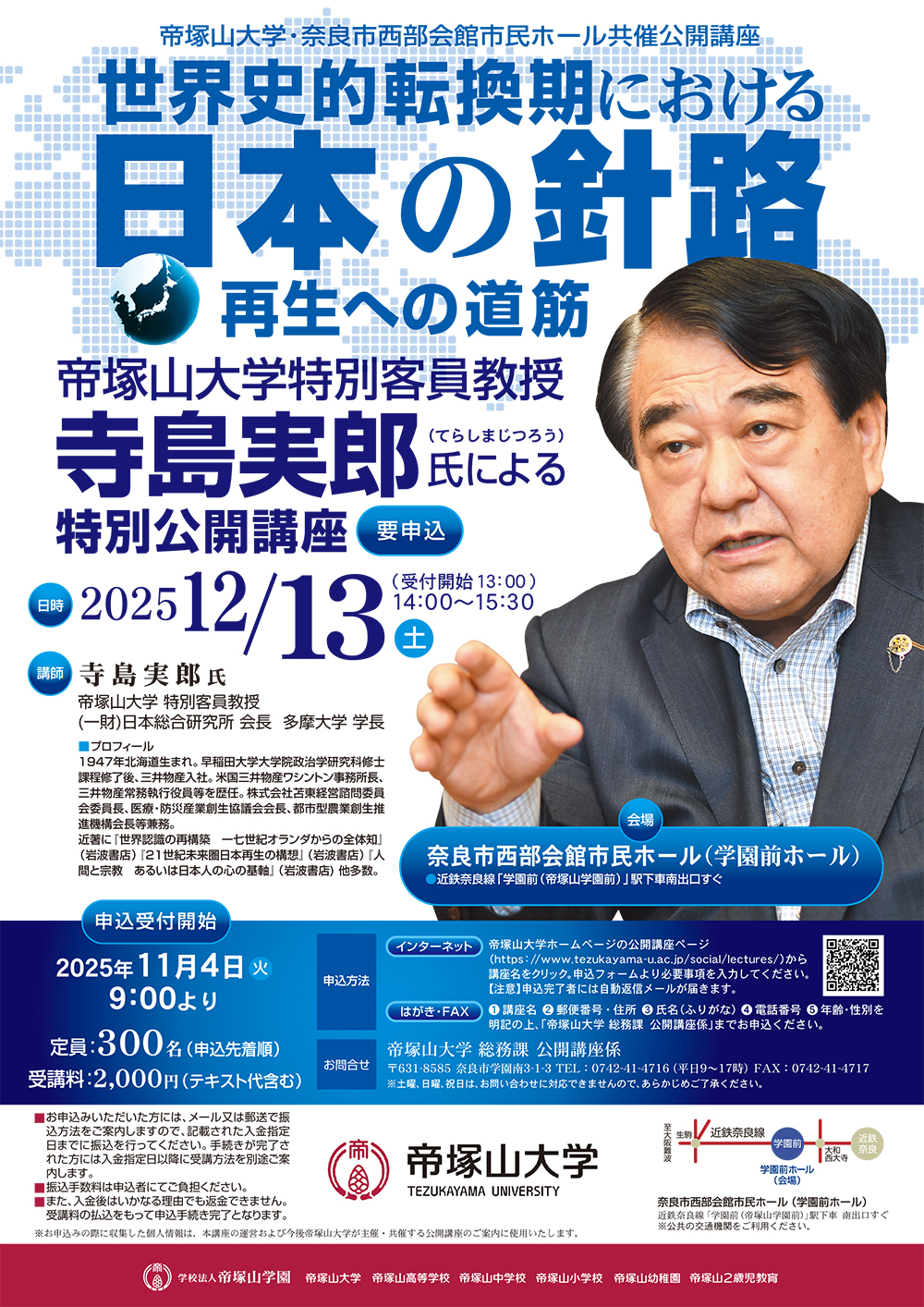【プレスリリース】帝塚山大学特別客員教授 寺島実郎氏による特別公開講座 「世界史的転換期における日本の針路 -再生への道筋-」 12月13日(土)14:00~ 於:学園前ホール(奈良市西部会館市民ホール)