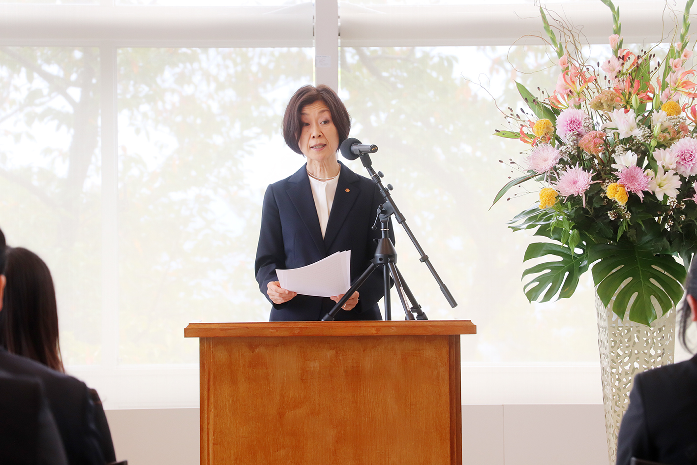 開学60周年を記念して新たに収録した大学歌「この丘に立てば」が流れる中、会場全体で斉唱。その後、奥村由美子学長が各学部の代表に卒業証書と学位記を授与しました。 式辞で奥村学長は、「本学のプロジェクト型学習で培った素養は社会でも必ず生きる」と温かく語り、「卒業後も大学を訪れ、成長した姿を見せてほしい」と卒業生に呼びかけました。