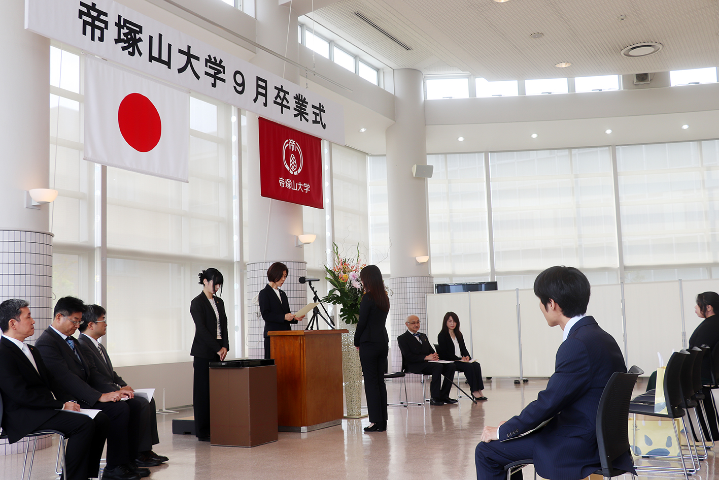 9月25日(木)、2025年度帝塚山大学9月卒業式を東生駒キャンパス「まほろば」で挙行し文学部、経済経営学部、法学部、心理学部の4学部から18名が学び舎を巣立ちました。