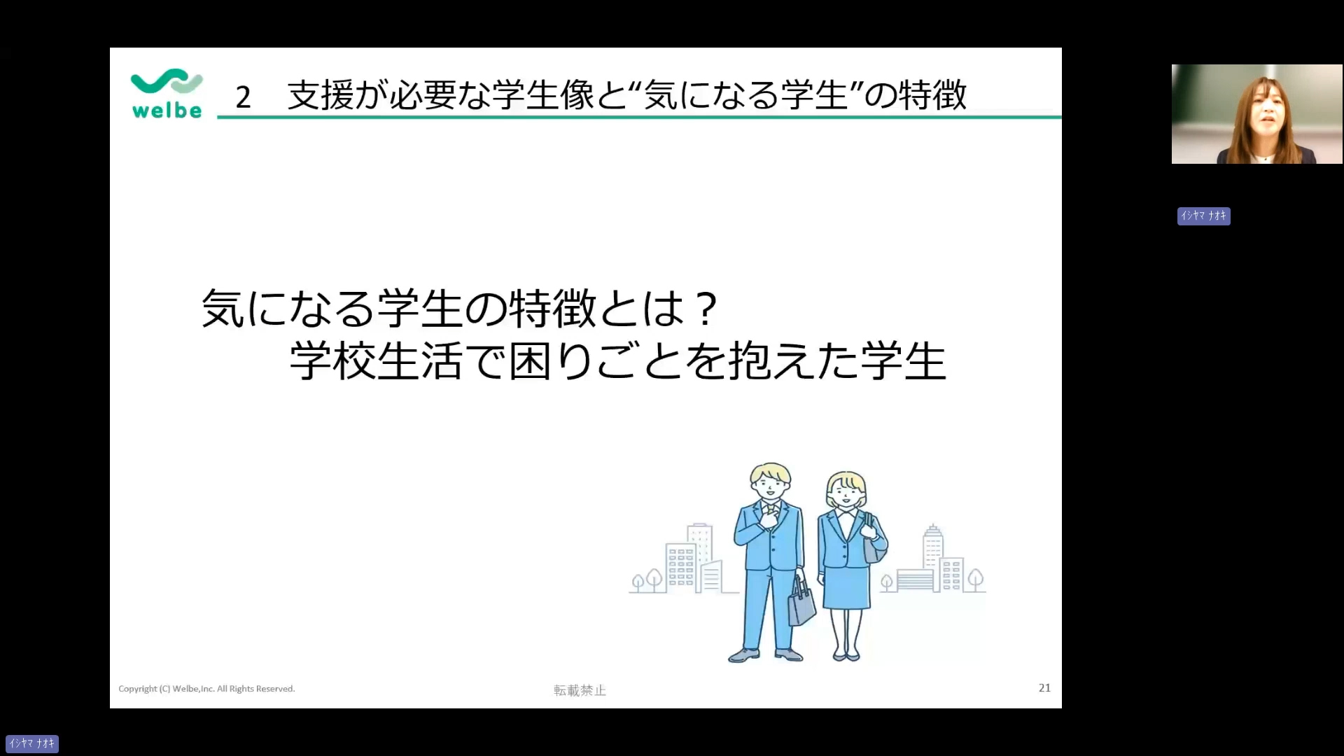 フォーラムでは、障害の診断の有無にかかわらず、学業や就職活動に困難を抱えた気になる学生」へのかかわり方が取り上げられました。授業に集中できない、孤立しがち、提出物の遅れが続くといった特徴を例に挙げ、見た目には分かりにくい困難を抱える学生に対し、教職員がどのように接するべきか解説。声かけの際に、共感を示し、具体的に伝えることが大切であるとのアドバイスがありました。また、同社の支援を活用した学生の事例も紹介され、学生が自身の特性を理解し、面接練習や職場実習を経て自信をつけ、就職につながった経緯が示されました。