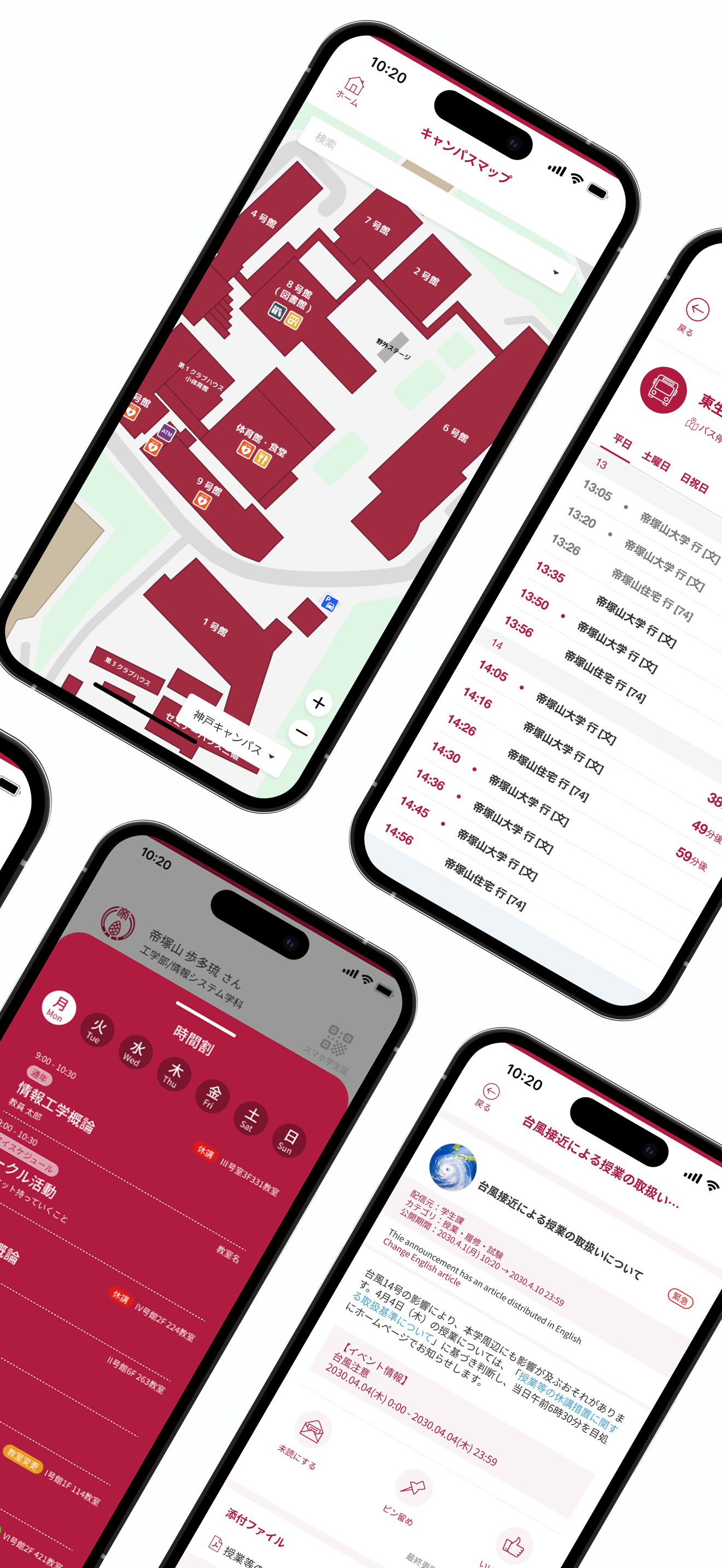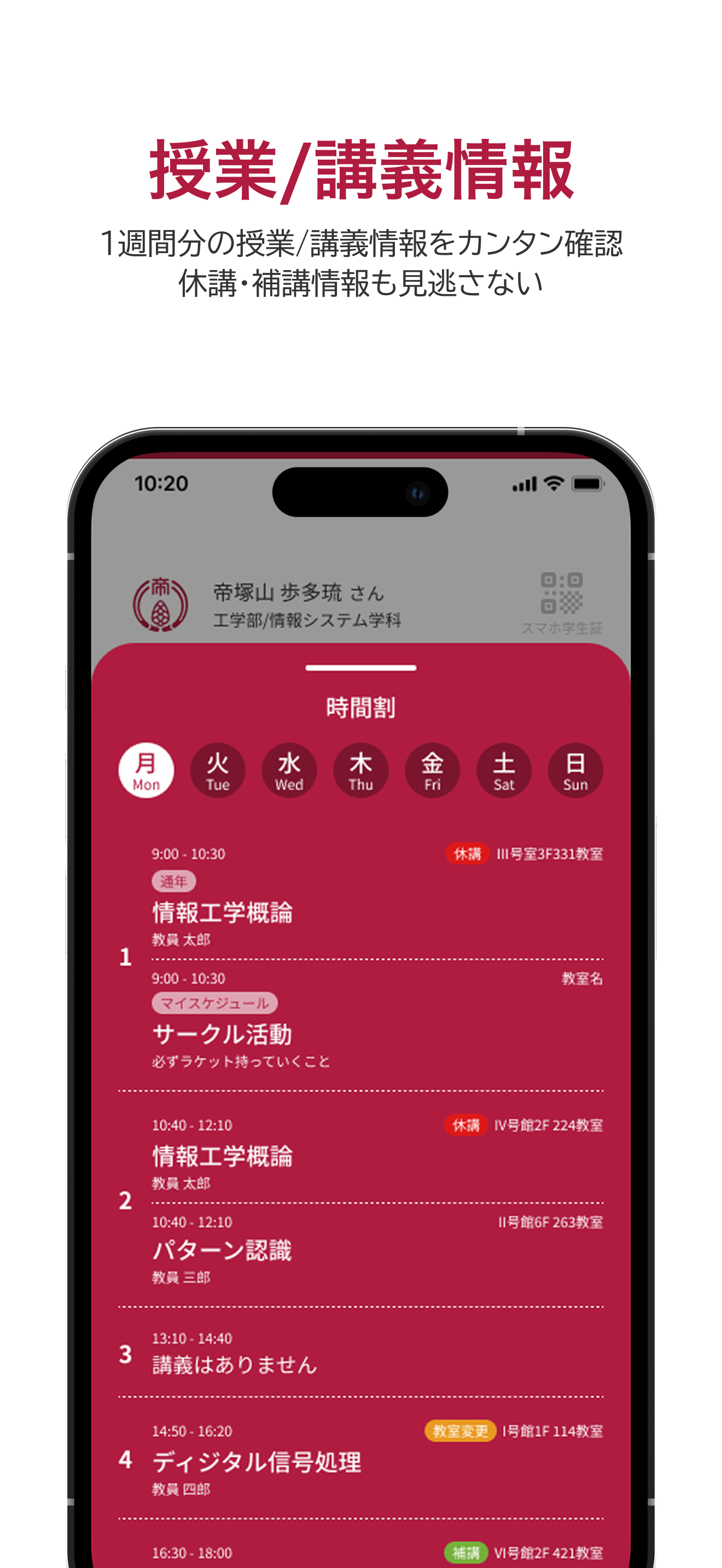 このアプリでは、時間割情報や休講情報・補講情報、教室変更情報をスマートフォンで簡単に確認することができます。