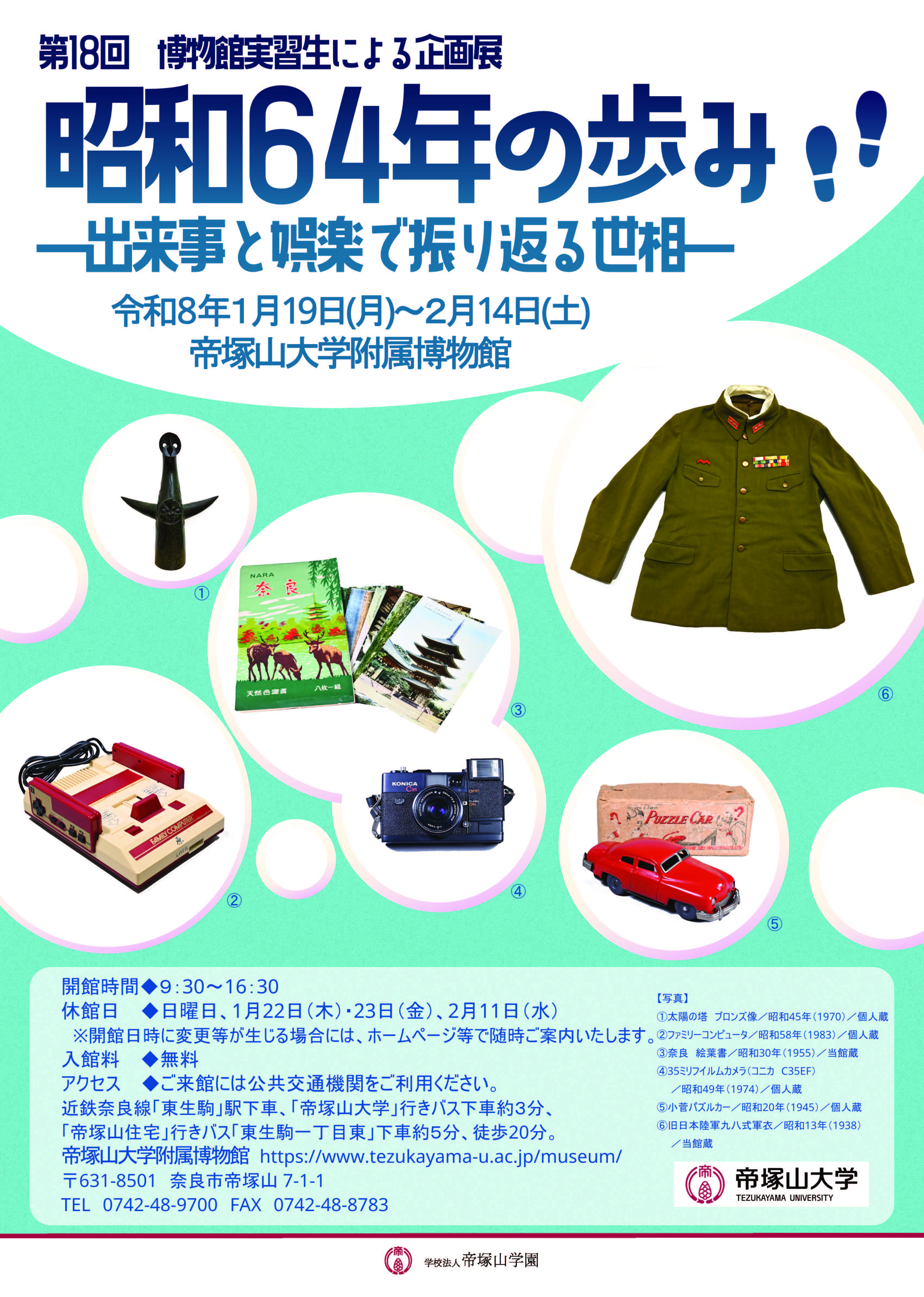 帝塚山大学附属博物館(館長:清水昭博 奈良市帝塚山7-1-1)は、1月19日(月)~2月14日(土)にかけて、第18回博物館実習生による企画展示「昭和64年の歩み ―出来事と娯楽で振り返る世相―」を開催します。