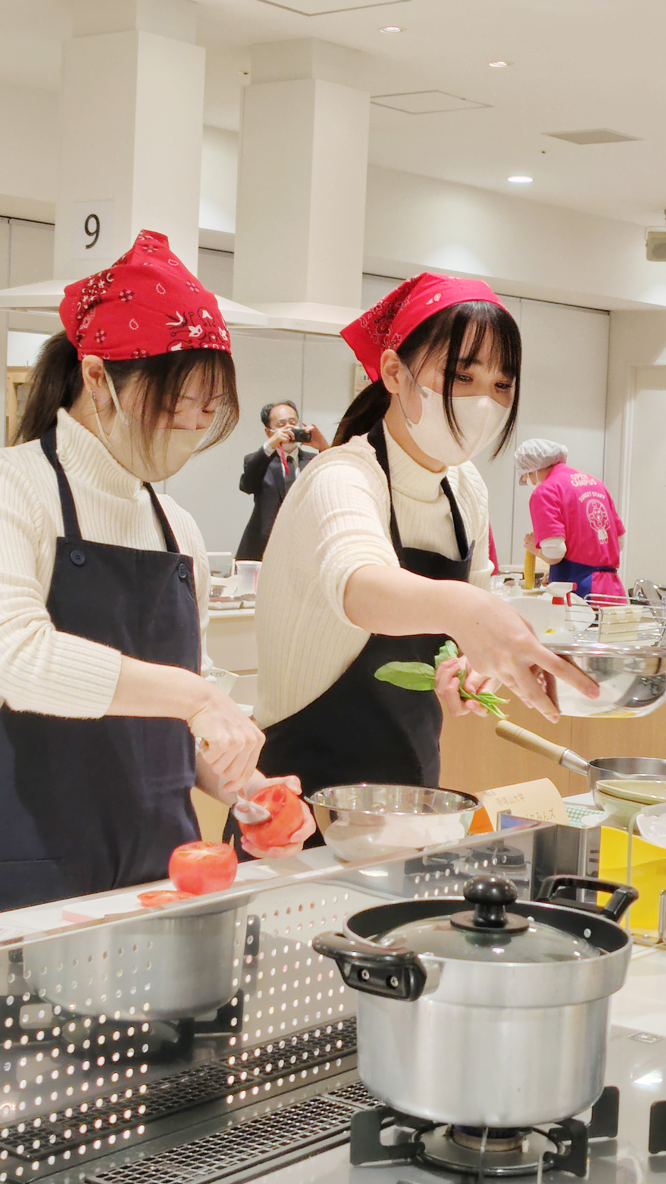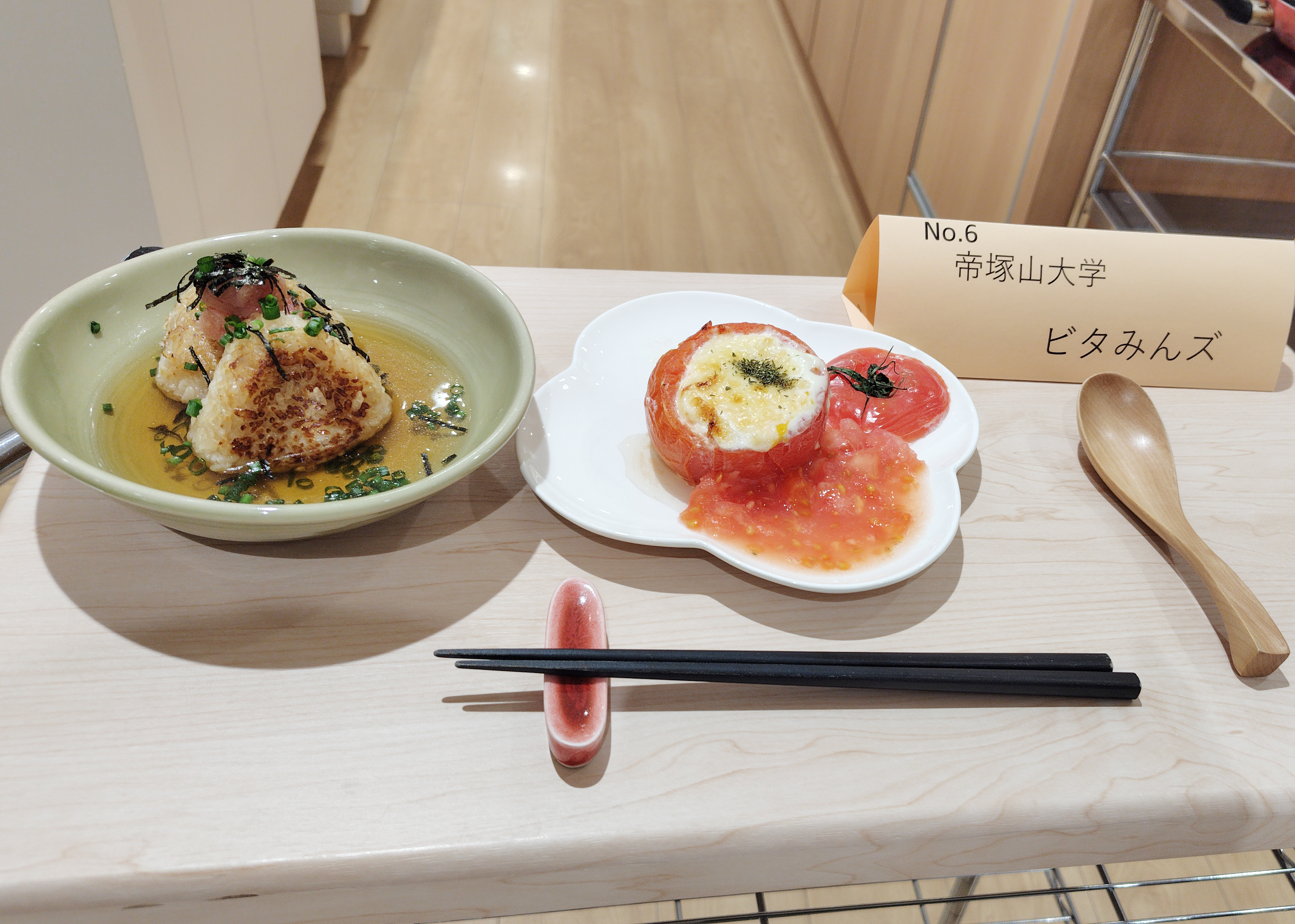 1月17日(土)、ハグミュージアム(大阪市西区)で行われた実演審査に、辻󠄀さんと森田さんは、忙しい朝でも簡単に作ることができる「焼きおにぎりの出し茶漬け」と「トマトエッグカップ」のセット「ボリューム満点!!満腹朝ごはん」で参戦しました。緊張の中、2人は手際よく彩り鮮やかな朝ごはんを仕上げ、銀賞に輝きました。