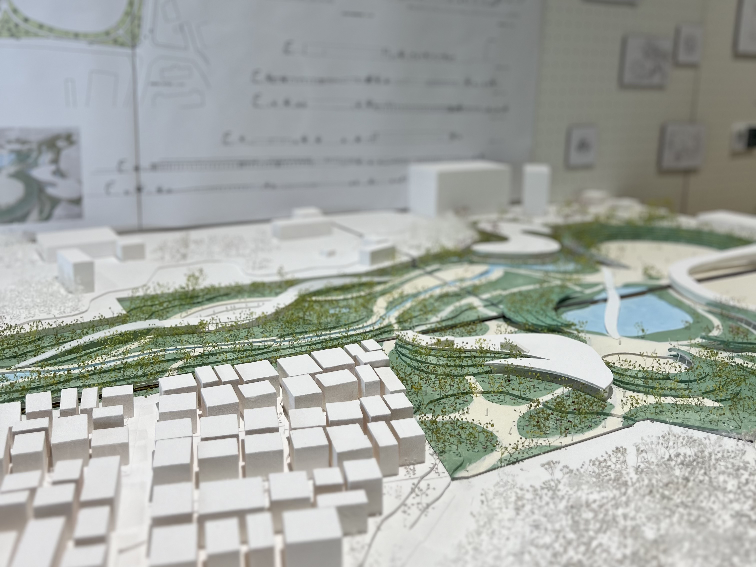 建築設計作品の中には、奈良市を計画地として設計した建築模型も含まれています。そのひとつである「奈良市における体験型水生植物園の設計提案」は、西大寺・喜光寺・唐招提寺・薬師寺の四寺を結ぶ「ロータスロード」にちなみ、ハスをテーマにした水生植物園を提案した作品です。このほかにも、建築、インテリア、プロダクト、グラフィック、各分野での成果が会場に並びます。