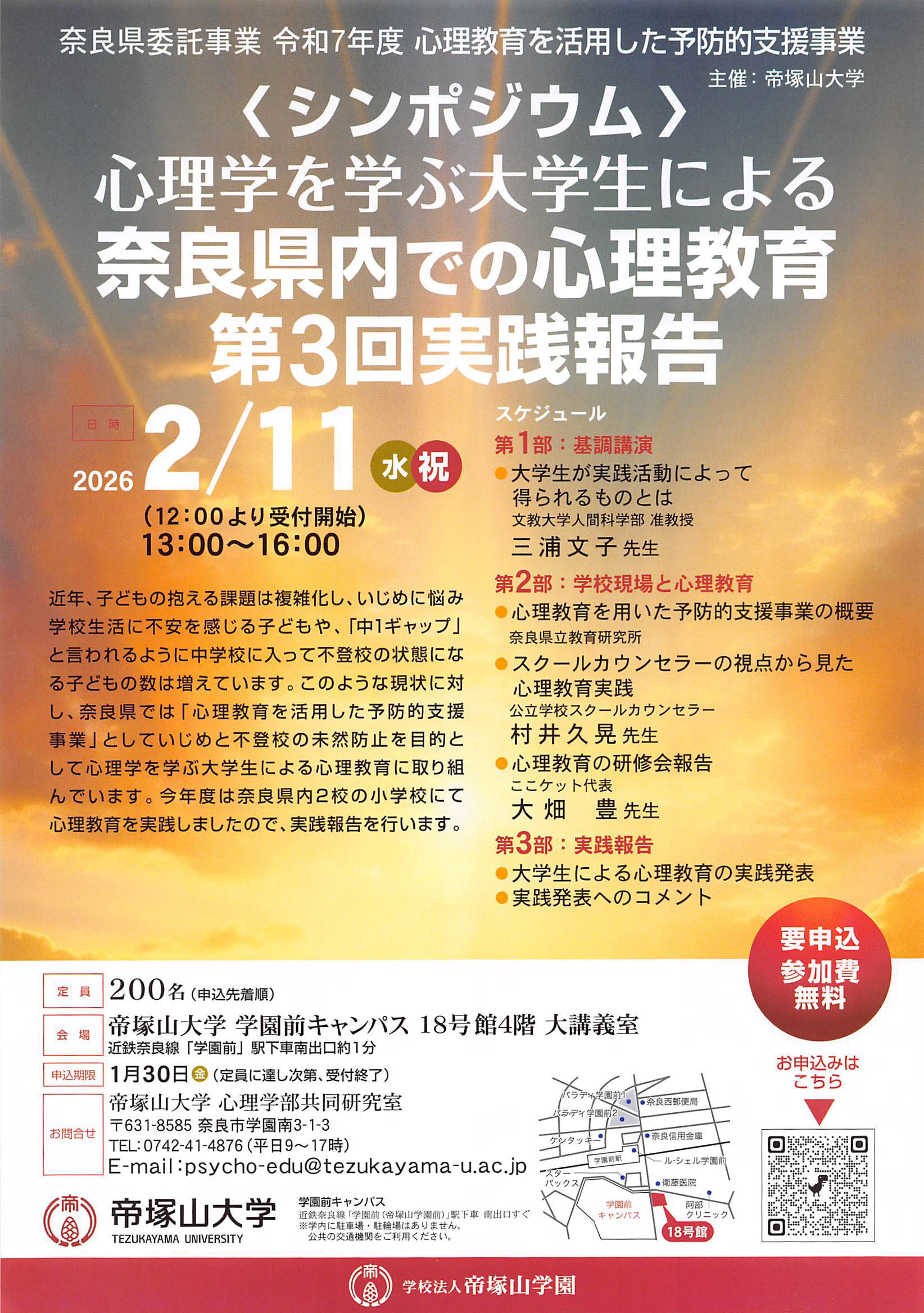 申込期限:1月30日(金) ※定員に達し次第、受付終了 大学HPの所定のフォームから申込みシンポジウム「心理学を学ぶ大学生による 奈良県内での心理教育 第3回実践報告」
