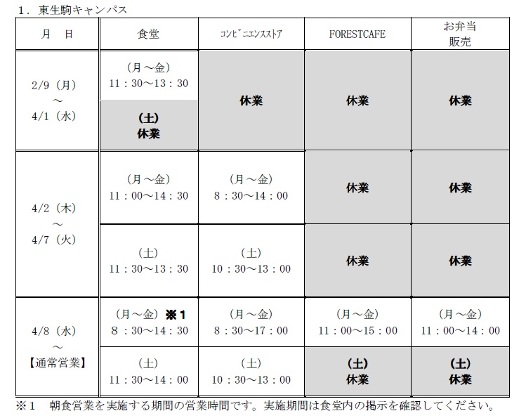 食堂等の営業時間の変更について(お知らせ)