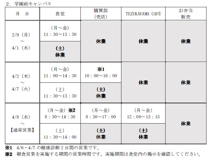 2月9日(月)以降の食堂等の営業時間の変更について、下記のとおりお知らせします。