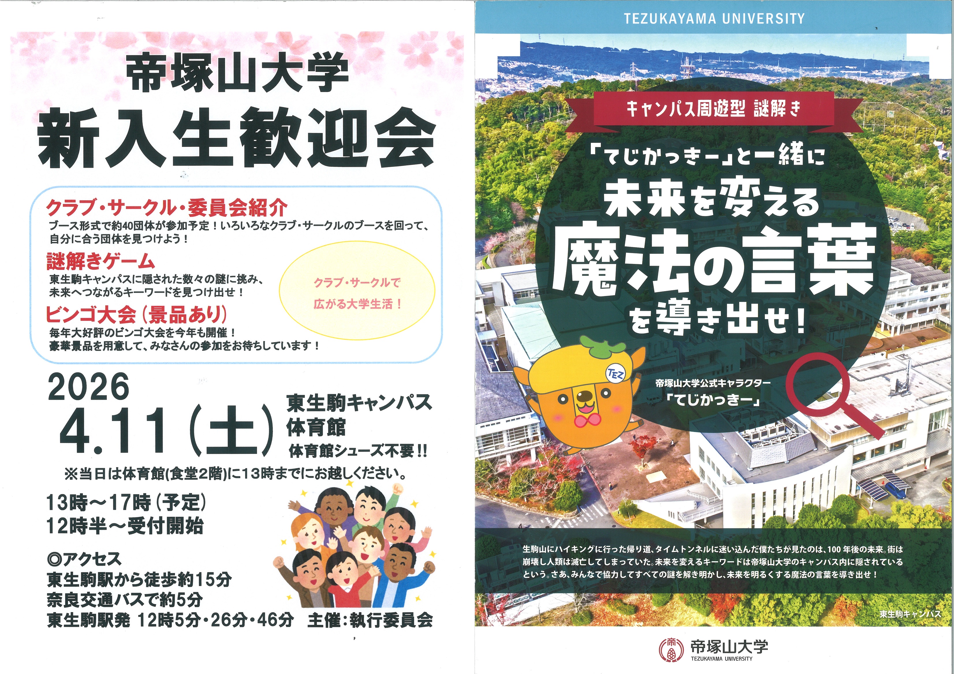 本年度は『「てじかっきー」一緒に未来を変える魔法の言葉を導き出せ!』と題し東生駒キャンパスに散りばめられた謎に挑戦していきます。桜が少し残る、好天に恵まれた午後に新入生たちは広い東生駒キャンパスのスポットに潜む謎を次々と解き明かしていきました。