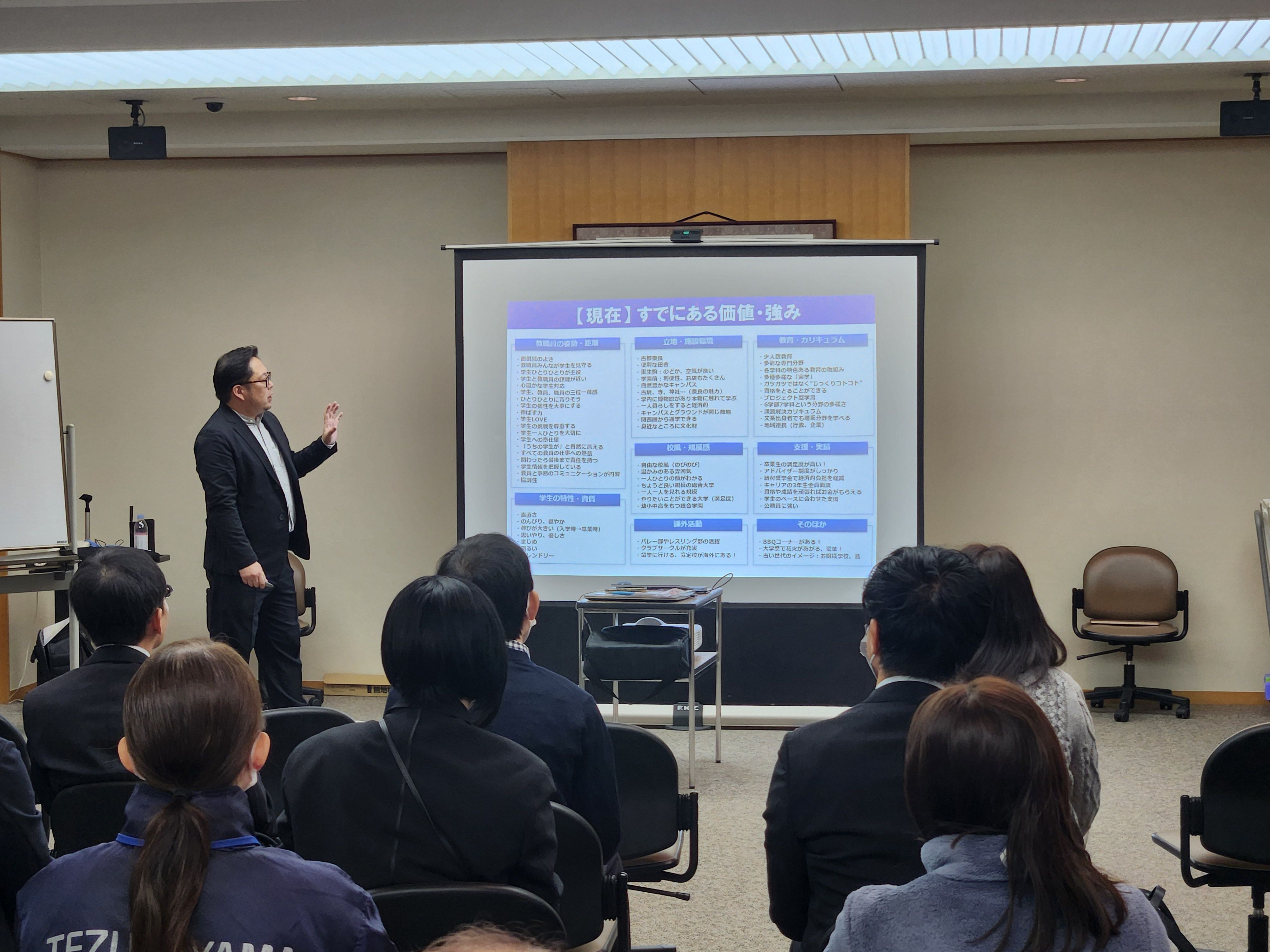 1月に本学の全教職員に対して、今までの教育の成果についてアンケートを実施し、2月には、学生や学長の本学に対する「想い」を聴いて、大学の置かれる環境について理解を深めました。3月には、教職員のプロジェクトメンバーによる本学の今までの状況や強みなどを話し合い、今後のあり方を検討しました。この結果を本学のメッセージとして皆さんに伝わりやすい形にしていきます。